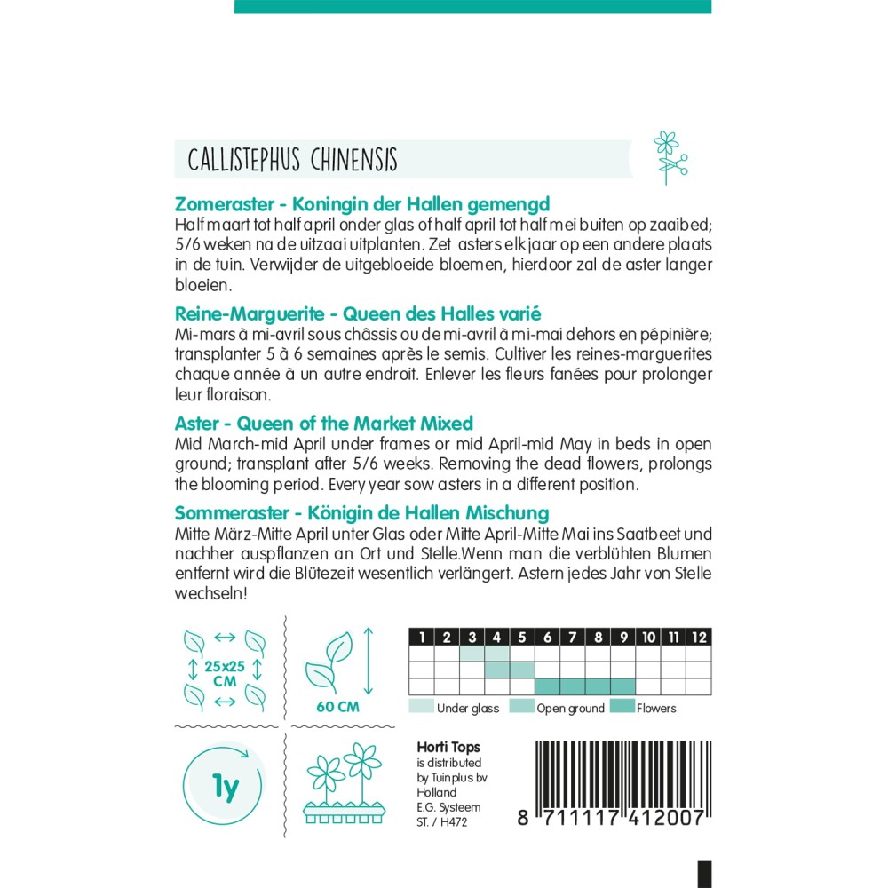 Zomeraster - Koningin der Hallen gemengd Half maart tot half april onder glas of half april tot half mei buiten op zaaibed; 5/6 weken na de uitzaai uitplanten. Zet asters elk jaar op een andere plaats in de tuin. Verwijder de uitgebloeide bloemen, hierdoor zal de aster langer bloeien.