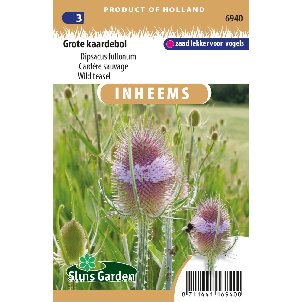 Inheemse zaden. De “Grote of Wilde kaardebol” is een tweejarige hoge plant, die tot wel 2 meter kan groeien. Heeft een heel aparte bloem en bloeiwijze. De zeer aparte bloemhoofden hebben mooie kleine lila bloempjes en produceren veel nectar. Zeer aantrekkelijk voor bijen, hommels en zaadetende vogels. Elk voorjaar vlak voor het uitlopen het oude loof wegknippen voor weer de mooiste groeiwijze.