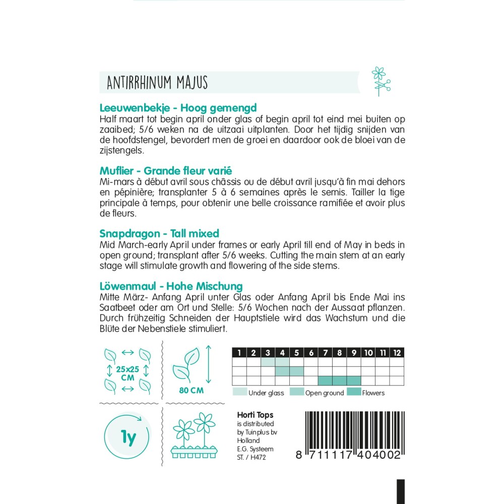 Snapdragon - Tall mixed Mid March-early April under frames or early April till end of May in beds in open ground; transplant after 5/6 weeks. Cutting the main stem at an early stage will stimulate growth and flowering of the side stems.