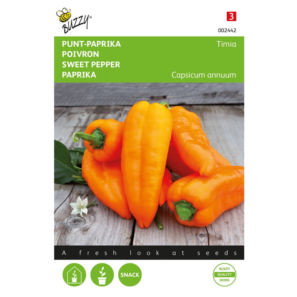 Sweet Pepper - Timia Pre-sow indoors from February to mid-May. After pricking out, plant out in a greenhouse or outside in a warm spot. Timia is a bright orange pointed pepper with sweet fruits that are 25 cm long and perfect for filling or to enjoy as a snack. The plants remain quite compact and are therefore also suitable for growing in pots.