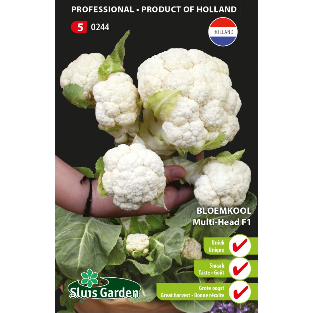 This cauliflower is a unique variety and will pleasantly surprise you. Each plant produces a number of side-shoots with beautiful cauliflower rosettes. The quicker you harvest the central cauliflower rosette, the quicker you can harvest from the side-shoots. A fine taste and easy to harvest for smaller dishes. Simply a unique product! Grow each year in a different place and protect the plant with insect netting. Total harvest of approx. 2.5 kg.