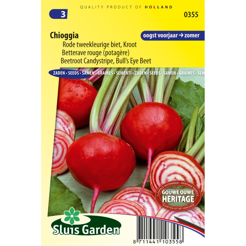 An attractive Italian variety, also called Basano. Particularly suitable for early cultivation. A round, smooth and light red beet, of which the beautiful flesh (white with pink rings) has a sweet and mild flavour. A fine product both raw and al dente. Sow in a sunny spot in well fertilized soil. Once the plants are 3 cm tall thin out to approx. 10 cm. Chioggia keeps reasonably well.