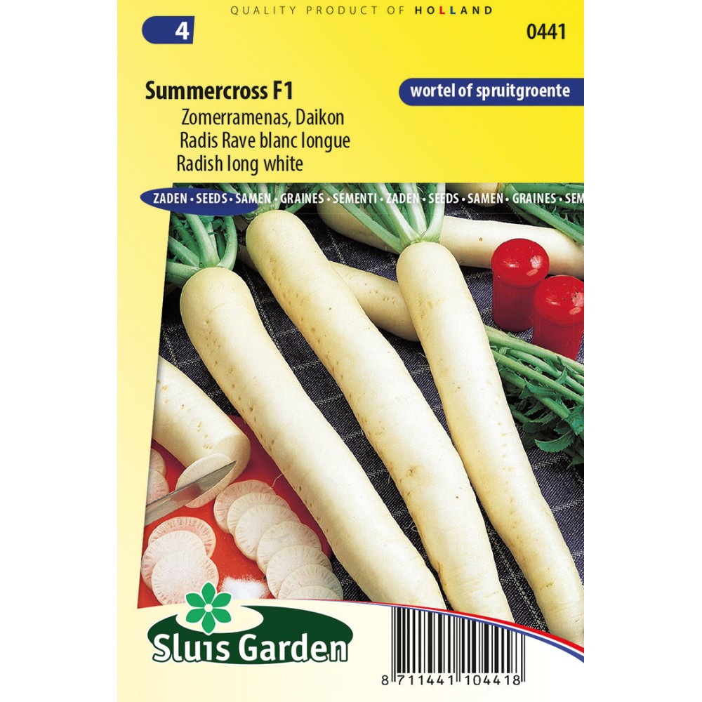 Long, white winter radish which is also called Daikon. Suitable for summer cultivation. The roots have a fairly sharp taste and can be eaten raw as a snack or, for example, in sandwiches. Is also an excellent sprout vegetable. Contains many different minerals such as calcium, potassium and phosphates as well as vitamins B and C. For winter storage twist off foliage, do not cut off . Sow thinly in rows. If too close, tubers do not form. Loosen up the soil and do not fertilize too much.