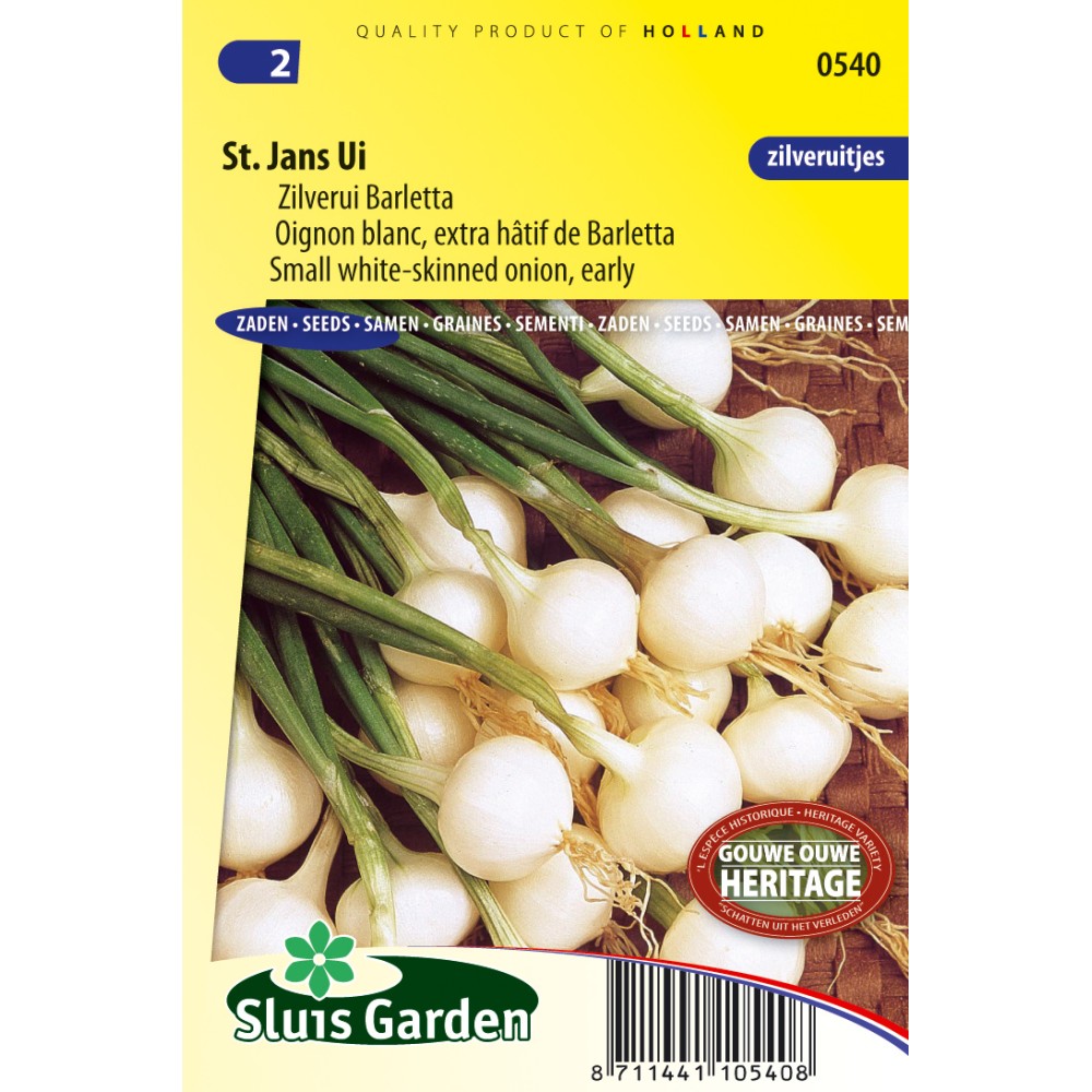 Small, white-skinned onions, also called pearl onions. Sow thinly directly in the garden in rows (row distance 25 cm and plant distance 5 cm), and cover the seed well. Onion requires darkness to germinate. Keep the soil moist constantly. After emergence do not thin out too much. Lightly fertilize the soil, preferably with compost. Can already be harvested in early summer as the leaves begin to collapse and wither.