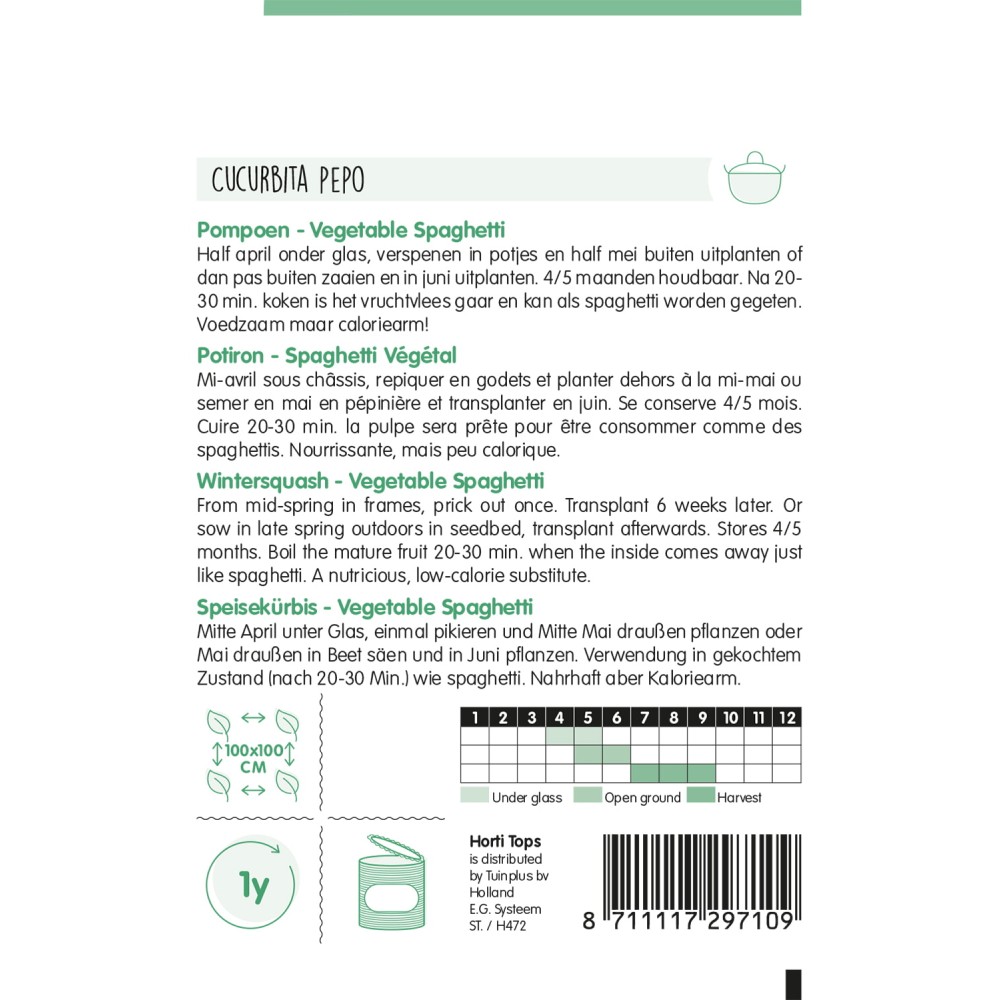 Wintersquash - Vegetable Spaghetti From mid-spring in frames, prick out once. Transplant 6 weeks later. Or sow in late spring outdoors in seedbed, transplant afterwards. Stores 4/5 months. Boil the mature fruit 20-30 min. when the inside comes away just like spaghetti. A nutricious, low-calorie substitute.