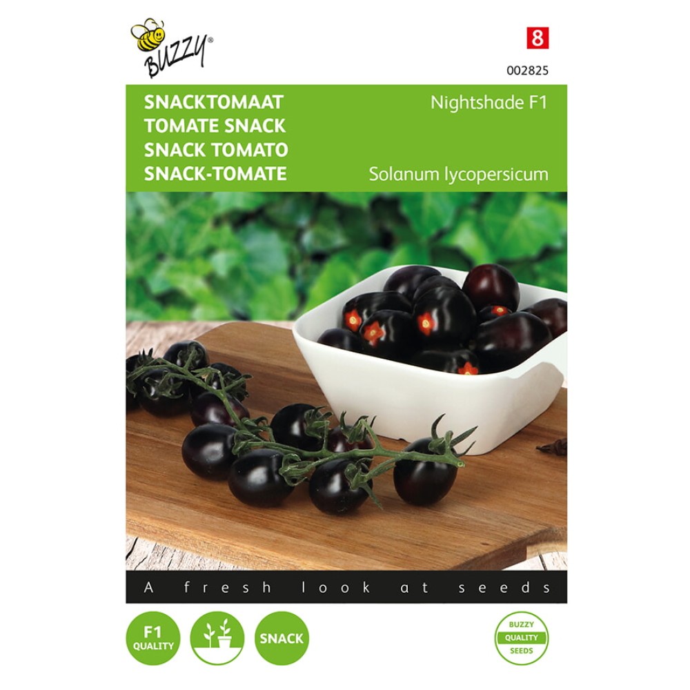 Sow indoors from end February to May. Transplant to a greenhouse or warm sheltered space as soon as the seedlings are large enough. Nightshade is an unique tomato variety as it is one of the first snack tomatoes to combine a very dark color with a very sweet taste. Harvest the tomatoes when the color below the sepal has changed from green to red.