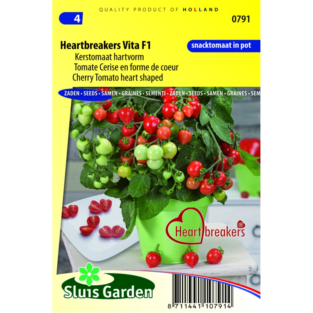 Pot-tomato Heartbreaker F1 has delicious heart-shaped snack tomatoes and is one of its kind. Sow in seed trays and as soon as they can be handled, prick out in pots or soil blocks. Later transplant to a greenhouse or outside to a warm, sheltered spot. Do NOT pinch out the top of Heartbreakers and do NOT remove the offshoots in the axils of the leaves. Ater transplanting, let the plant grow and harvest only the fruits when ready. After some time fertilize with tomato feed.