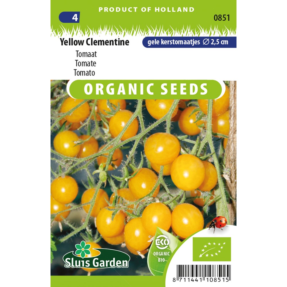 Organically grown seeds. Tomato Yellow Clementine produces very large bunches of round yellow cherry tomatoes. The tomatoes weigh approx. 10 grams and are approx. 2.5 cm in diameter. Ideal for using in your salads, pasta and sauce. Yellow Clementine is also ideal as patio tomato, but then top the plant in time, when sufficient flower clusters have been formed.