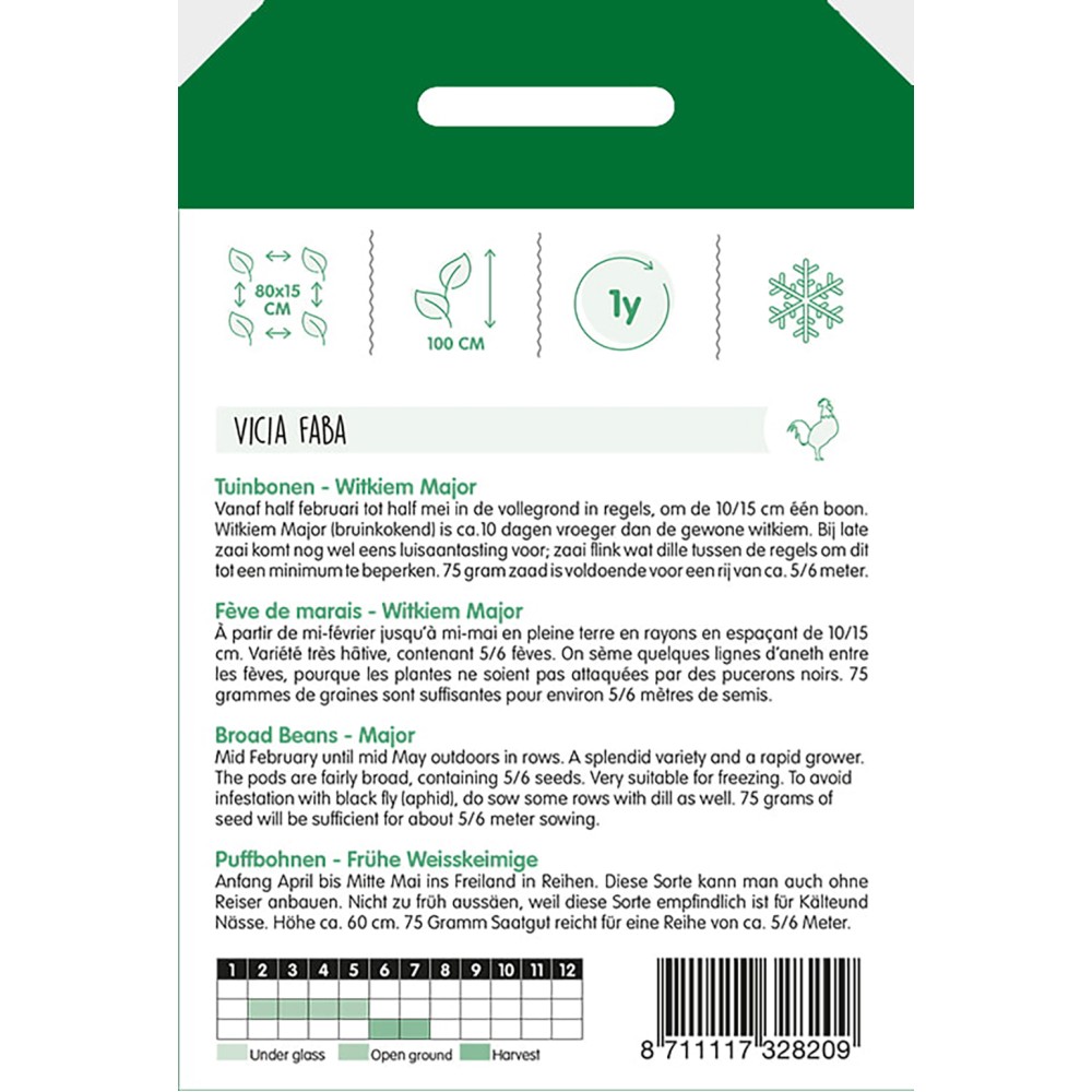 Mid February until mid May outdoors in rows. A splendid variety and a rapid grower. The pods are fairly broad, containing 5/6 seeds. Very suitable for freezing. To avoid infestation with black fly (aphid), do sow some rows with dill as well.