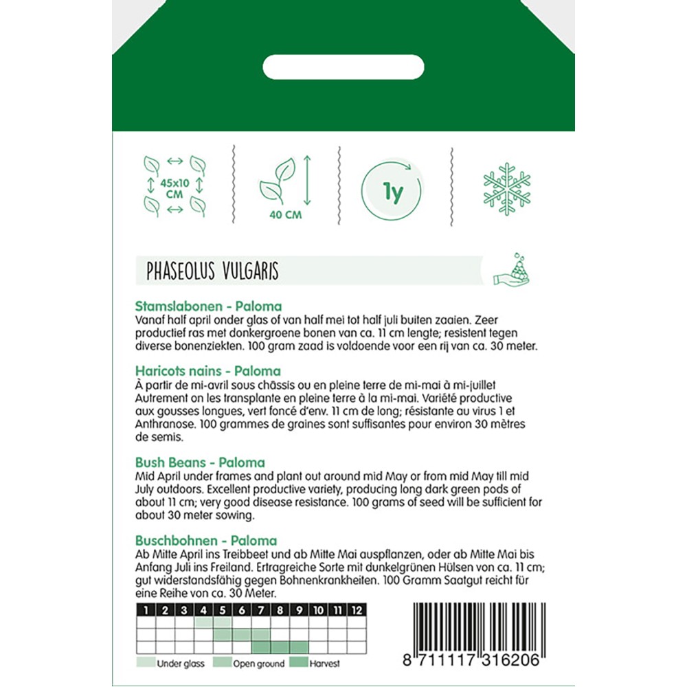 Mid April under frames and plant out around mid May or from mid May till mid July outdoors. Excellent productive variety, producing long dark green pods of about 11 cm; very good disease resistance.