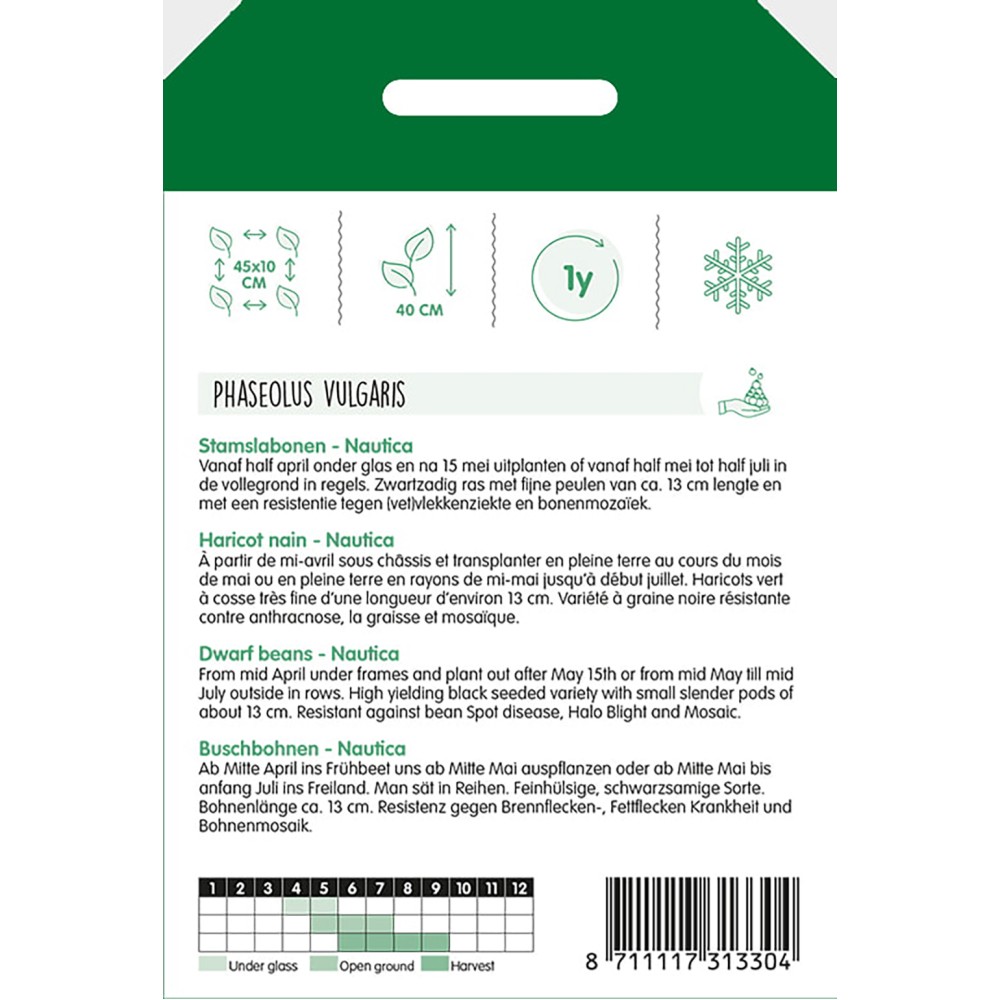 From mid April under frames and plant out after May 15th or from mid May till mid July outside in rows. High yielding black seeded variety with small slender pods of about 13 cm. Resistant against bean Spot disease, Halo Blight and Mosaic.