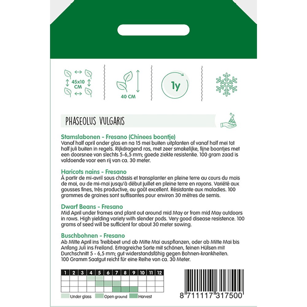 Mid April under frames and plant out around mid May or from mid May outdoors in rows. High yielding variety with slender pods. Very good disease resistence.
