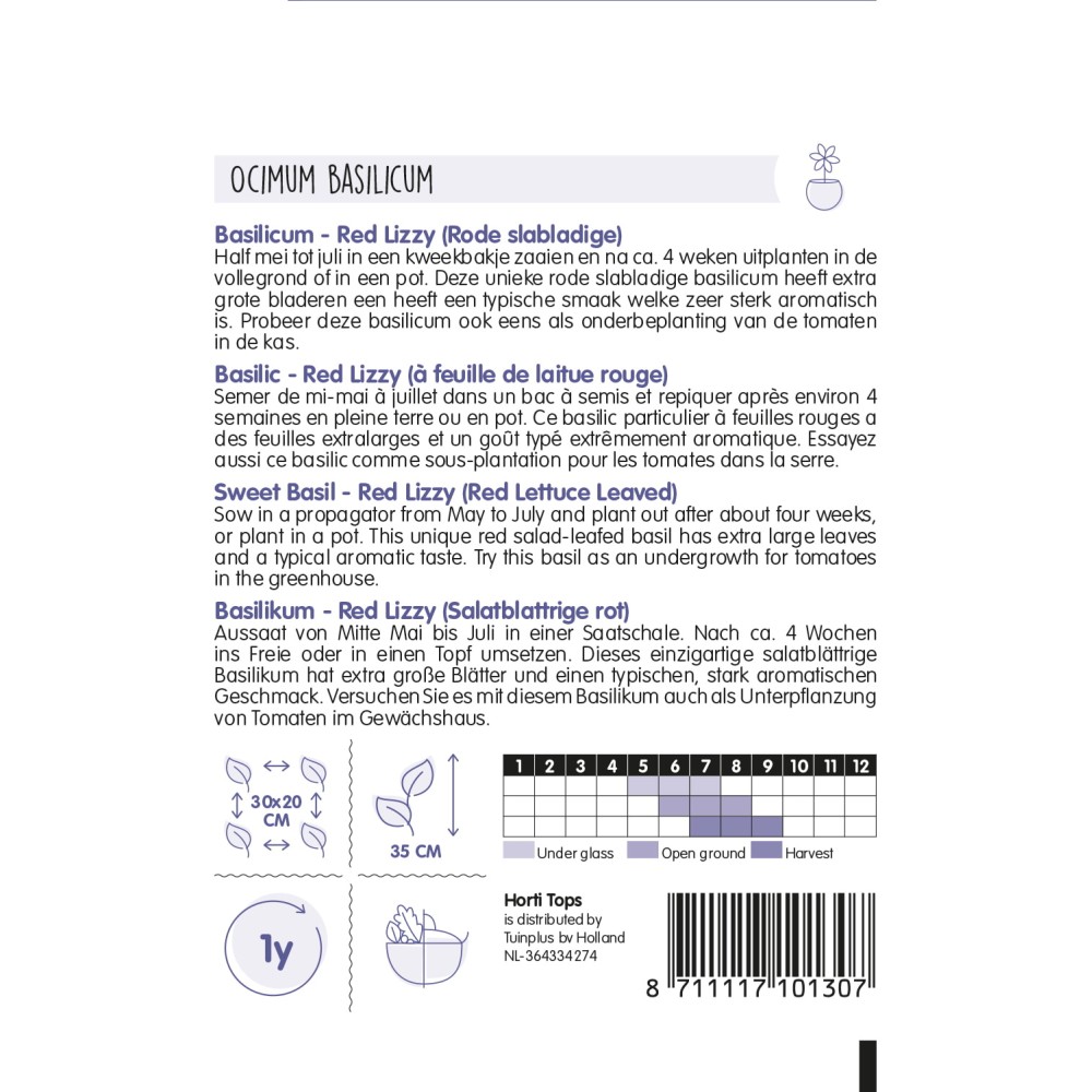 Sweet Basil - Red Lizzy (Red Lettuce Leaved) Sow in a propagator from May to July and plant out after about four weeks, or plant in a pot. This unique red salad-leafed basil has extra large leaves and a typical aromatic taste. Try this basil as an undergrowth for tomatoes in the greenhouse.