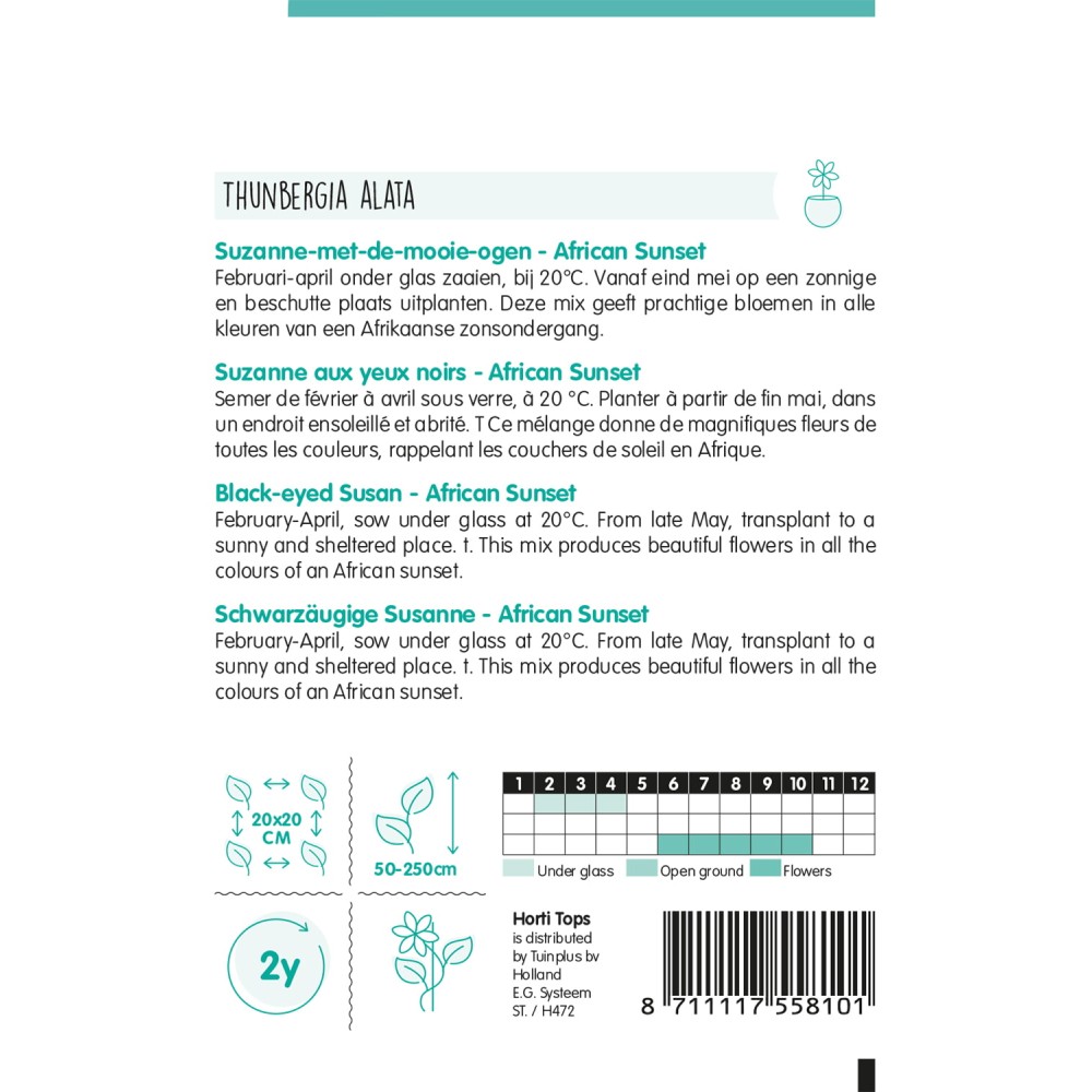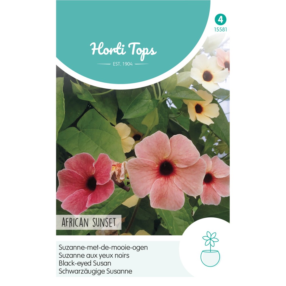 Black-eyed Susan - African Sunset February-April, sow under glass at 20°C. From late May, transplant to a sunny and sheltered place. This mix produces beautiful fl owers in all the colours of an African sunset. Hortitops Special Edition