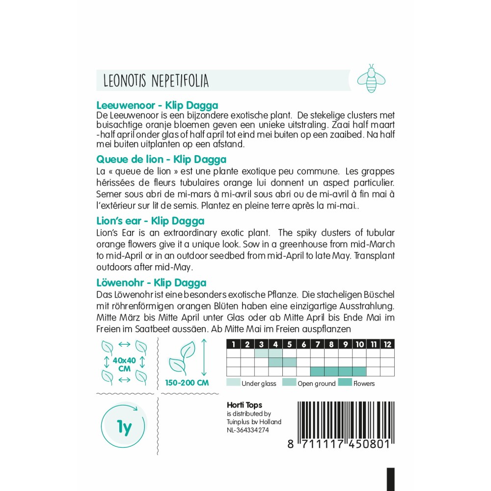 Lion’s ear - Klip Dagga Lion’s Ear is an extraordinary exotic plant. The spiky clusters of tubular orange flowers give it a unique look. Sow in a greenhouse from mid-March to mid-April or in an outdoor seedbed from mid-April to late May. Transplant outdoors after mid-May.