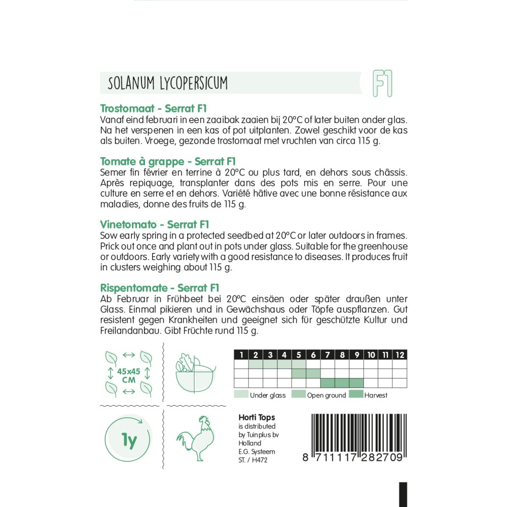 Sow early spring in a protected seedbed at 20ºC or later outdoors in frames. Prick out once and plant out in pots under glass. Suitable for the greenhouse or outdoors. Early variety with a good resistance to diseases. It produces fruit in clusters weighing about 115 g.