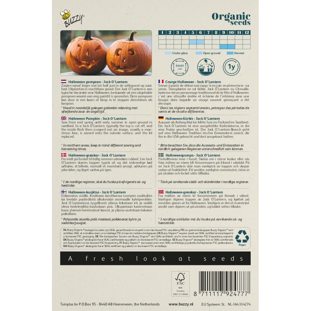 À partir de début mai jusqu’à mi-juin en pleine terre sur semis. Transplanter en sol fertile. Jack O’Lantern ou Citrouille-lanterne est un personnage traditionnel de la fête d’Halloween: c’est une citrouille évidée et éclairée de l’intérieur avec une bougie dans laquelle un visage souvent grimaçant a été découpé.