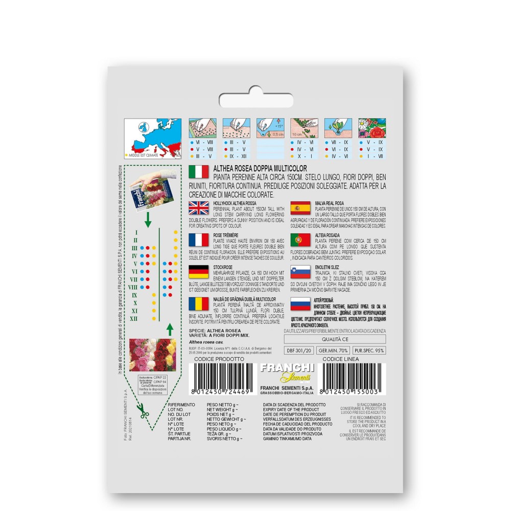 La rose trémière est une famille de mauve (Malvaceae), ce mélange bisannuel s'appelait Althaea, maintenant elles s'appellent Alcea rosea. La plupart des roses trémières sont des croisements entre différentes espèces. Les fleurs peuvent atteindre 180 centimètres et fleurissent magnifiquement avec des fleurs à fleurs doubles en toutes sortes de nuances.