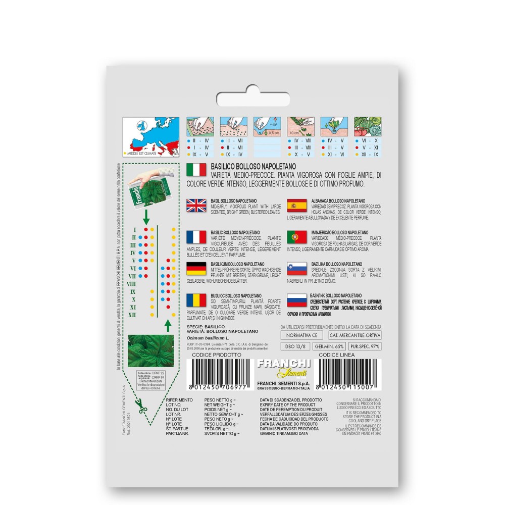 Une plante puissante avec de grandes feuilles vertes parfumées. Basilic à feuilles larges de la région de Napoli. Très apprécié pour son goût. Période de semis: janvier à juillet. Période de récolte: mai à novembre.