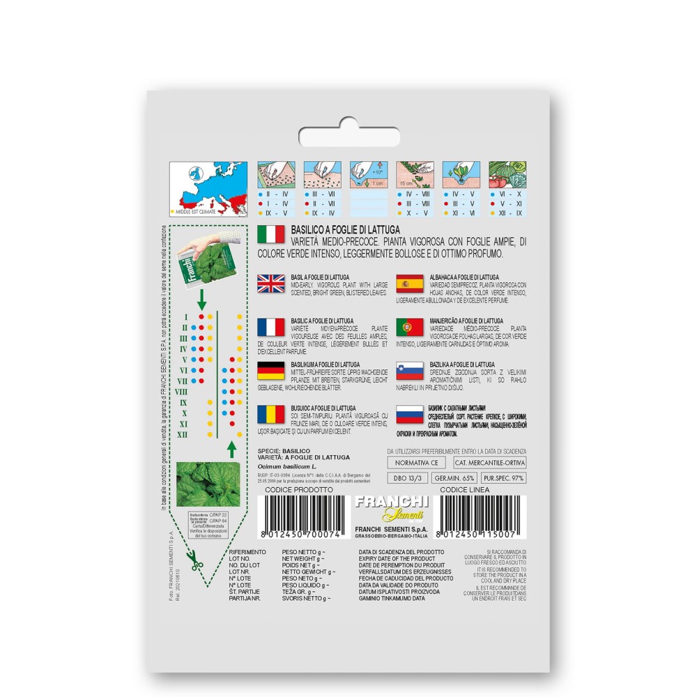 Une plante puissante avec de grandes feuilles vertes parfumées. Semez quand il y a assez de chaleur, de belles grandes feuilles, idéales pour le pesto. Période de semis: janvier à juillet. Période de récolte: mai à novembre.