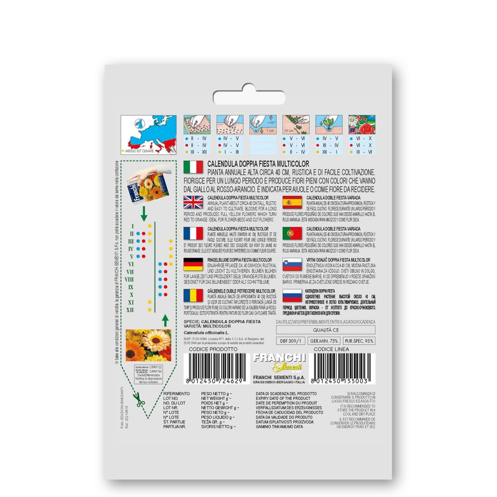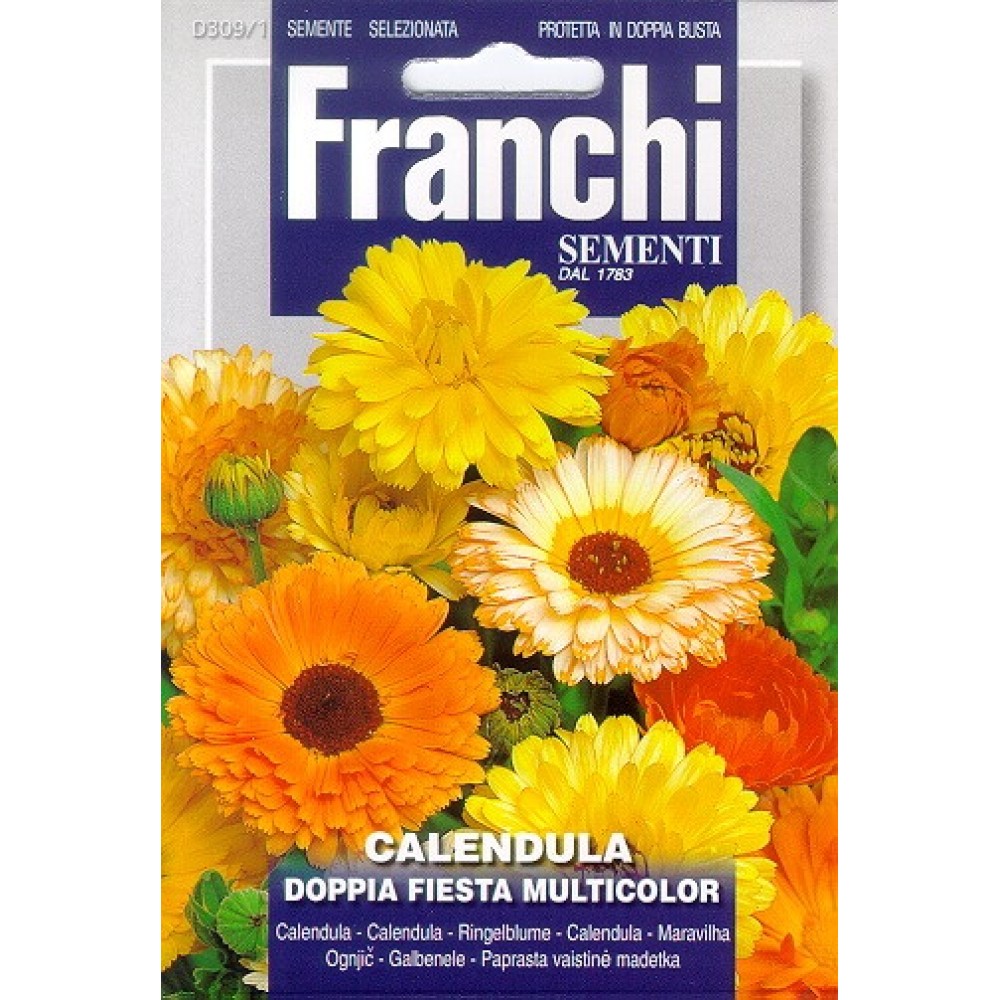 Doppia Fiesta Multicolor est un mélange de souci magnifique et facile à cultiver, les fleurs fleurissent de juin à octobre. Les fleurs d'or appartiennent à la famille des composites (Compositae) et sont originaires d'Europe du Sud. Dans le passé, les plantes étaient souvent plantées contre les maisons contre les fourmis .