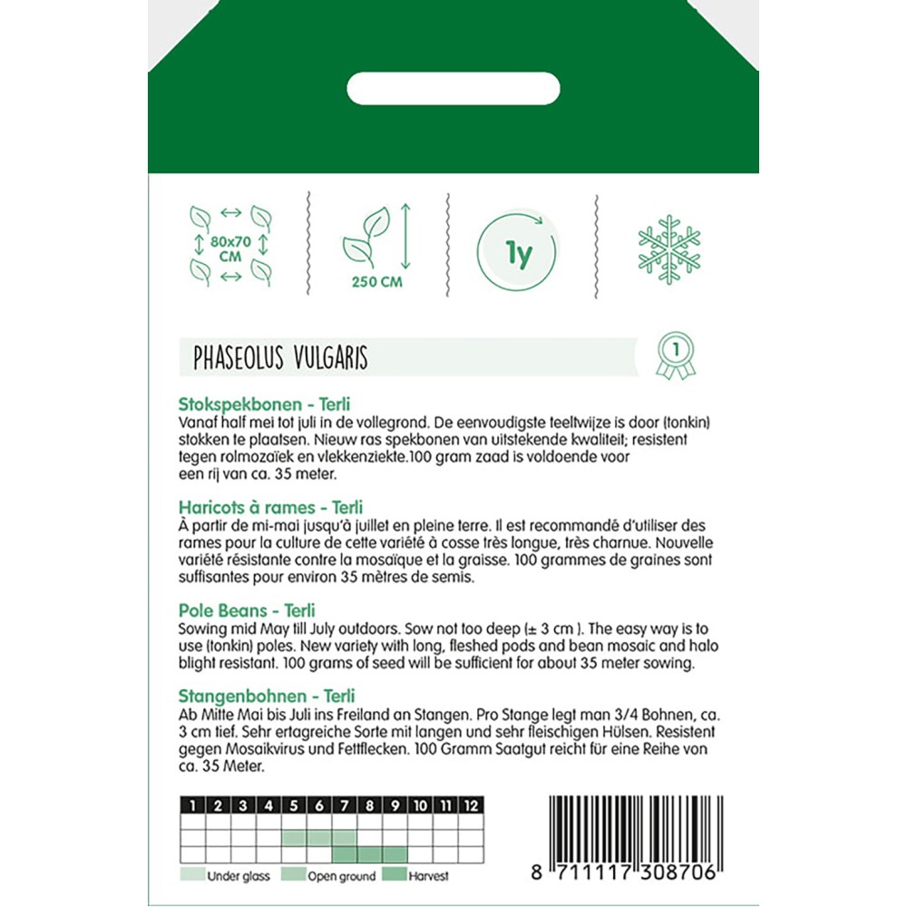 Haricots à rames - Terli À partir de mi-mai jusqu’à juillet en pleine terre. Il est recommandé d’utiliser des rames pour la culture de cette variété à cosse très longue, très charnue. Nouvelle variété résistante contre la mosaïque et la graisse. 100 grammes de graines sont suffisantes pour environ 35 mètres de semis.