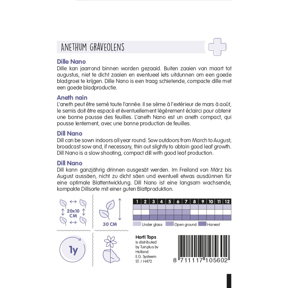 L’aneth peut être semé toute l’année. Il se sème à l’extérieur de mars à août, le semis doit être espacé et éventuellement légèrement éclairci pour obtenir une bonne pousse des feuilles. L’aneth Nano est un aneth compact, qui pousse lentement, avec une bonne production de feuilles.