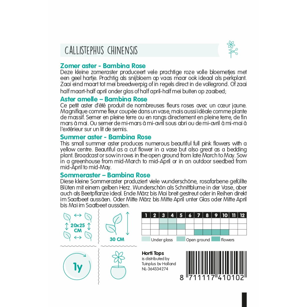 Aster amelle – Bambina Rose Ce petit aster d’été produit de nombreuses fleurs roses avec un coeur jaune. Magnifique comme fleur coupée dans un vase, mais aussi idéale comme plante de massif. Semer en pleine terre ou en rangs directement en pleine terre, de fin mars à mai. Ou semer de mi-mars à mi-avril sous abri ou de mi-avril à mi-mai à l’extérieur sur un lit de semis.