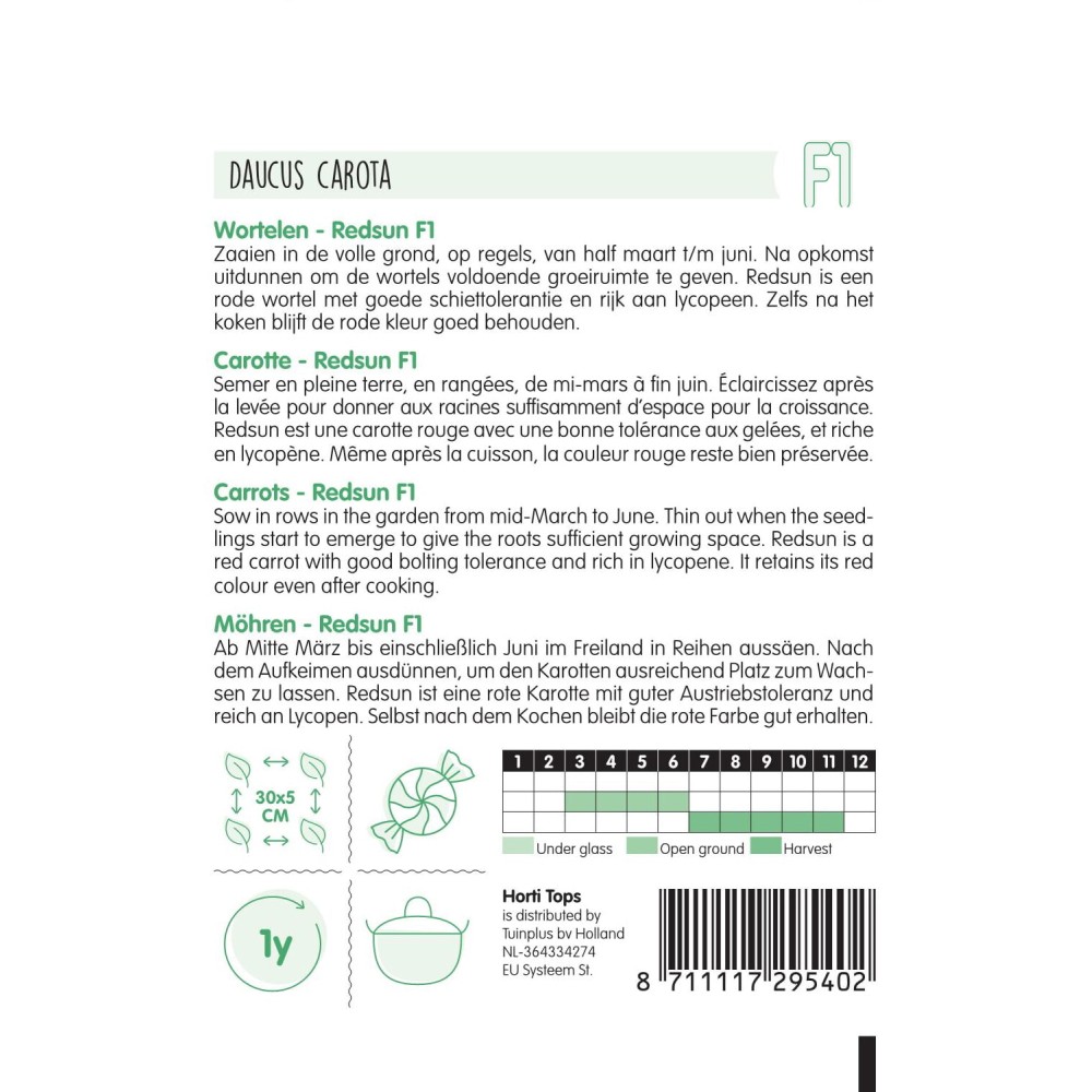 Semer en pleine terre, en rangées, de mi-mars à fin juin. Éclaircissez après la levée pour donner aux racines suffi samment d’espace pour la croissance. Redsun est une carotte rouge avec une bonne tolérance aux gelées, et riche en lycopène. Même après la cuisson, la couleur rouge reste bien préservée.