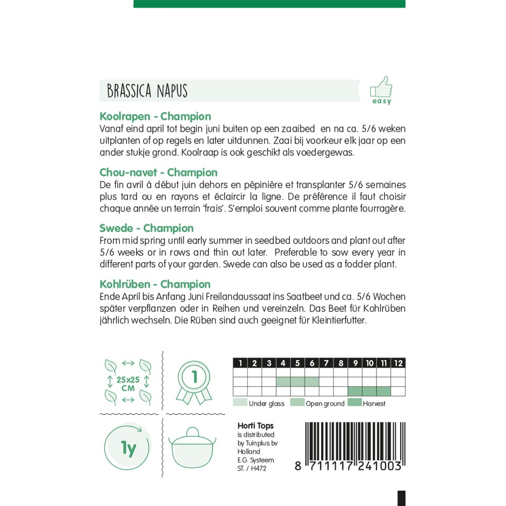 De fin avril à début juin dehors en pépinière et transplanter 5/6 semaines plus tard ou en rayons et éclaircir la ligne. De préférence il faut choisir chaque année un terrain ‘frais’. S’emploi souvent comme plante fourragère.