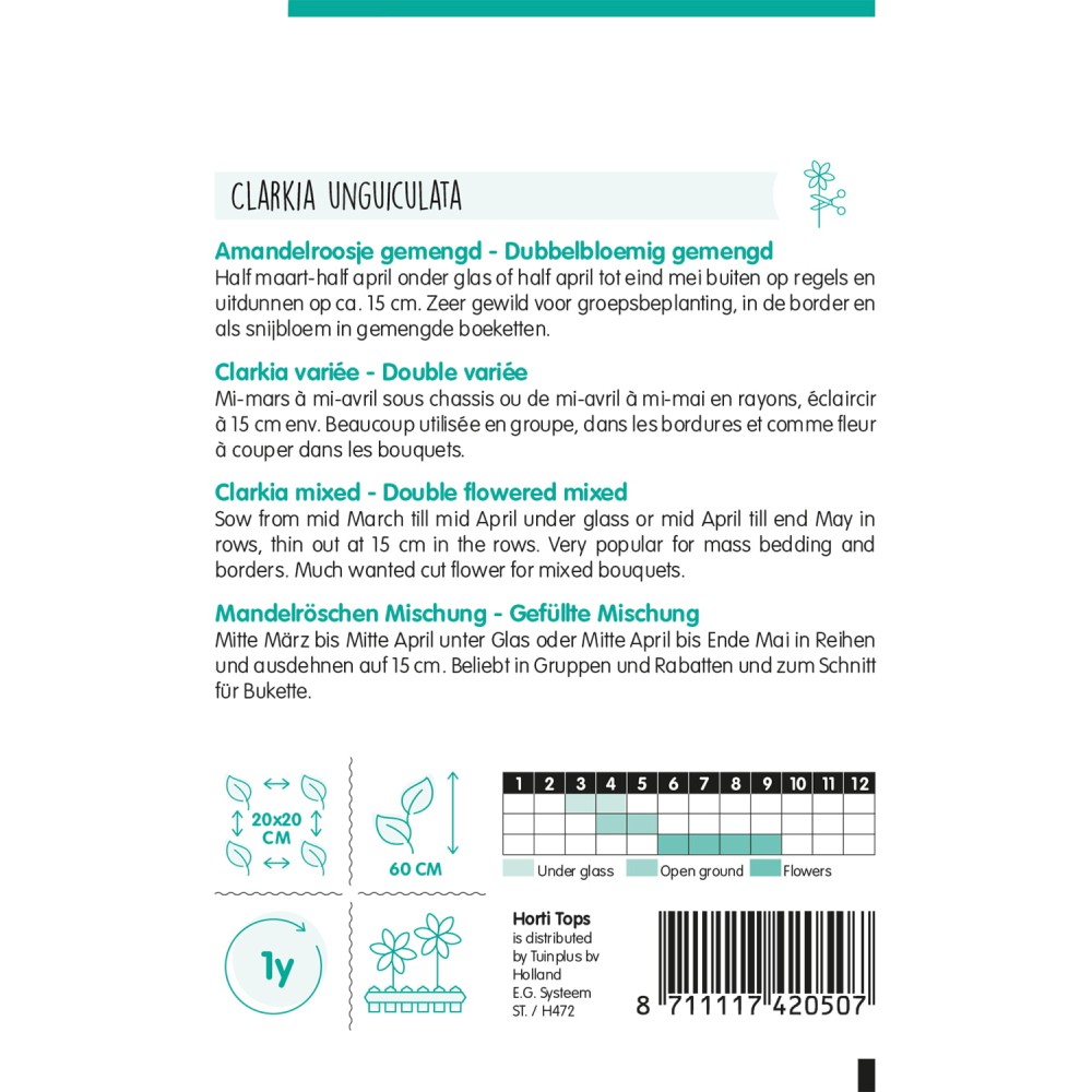 Mi-mars à mi-avril sous chassis ou de mi-avril à mi-mai en rayons, éclaircir à 15 cm env. Beaucoup utilisée en groupe, dans les bordures et comme fleur à couper dans les bouquets.