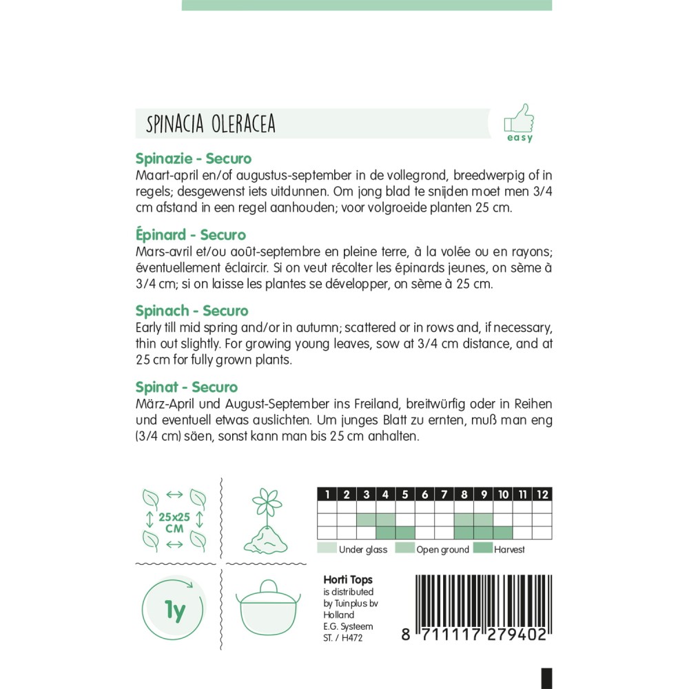 Épinard - Securo Mars-avril et/ou août-septembre en pleine terre, à la volée ou en rayons; éventuellement éclaircir. Si on veut récolter les épinards jeunes, on sème à 3/4 cm; si on laisse les plantes se développer, on sème à 25 cm.