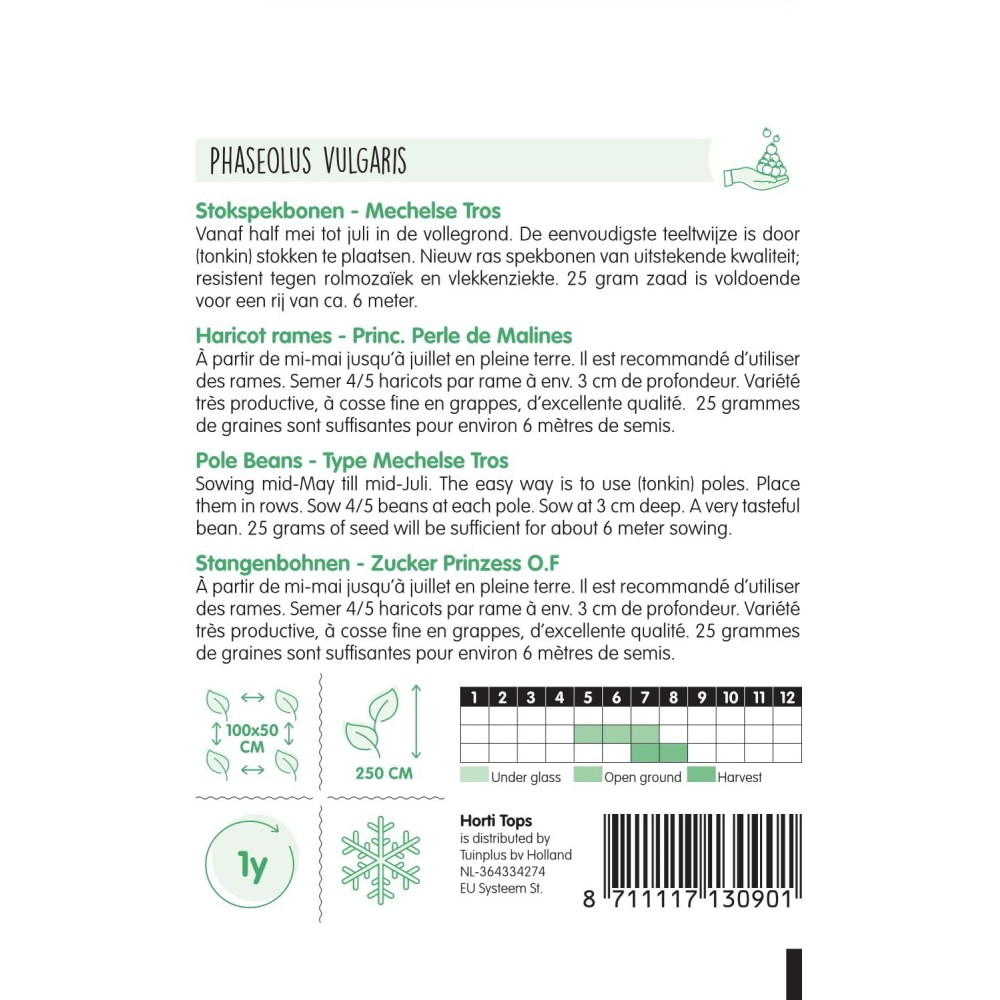 des rames. Semer 4/5 haricots par rame à env. 3 cm de profondeur. Variété très productive, à cosse fine en grappes, d’excellente qualité.
