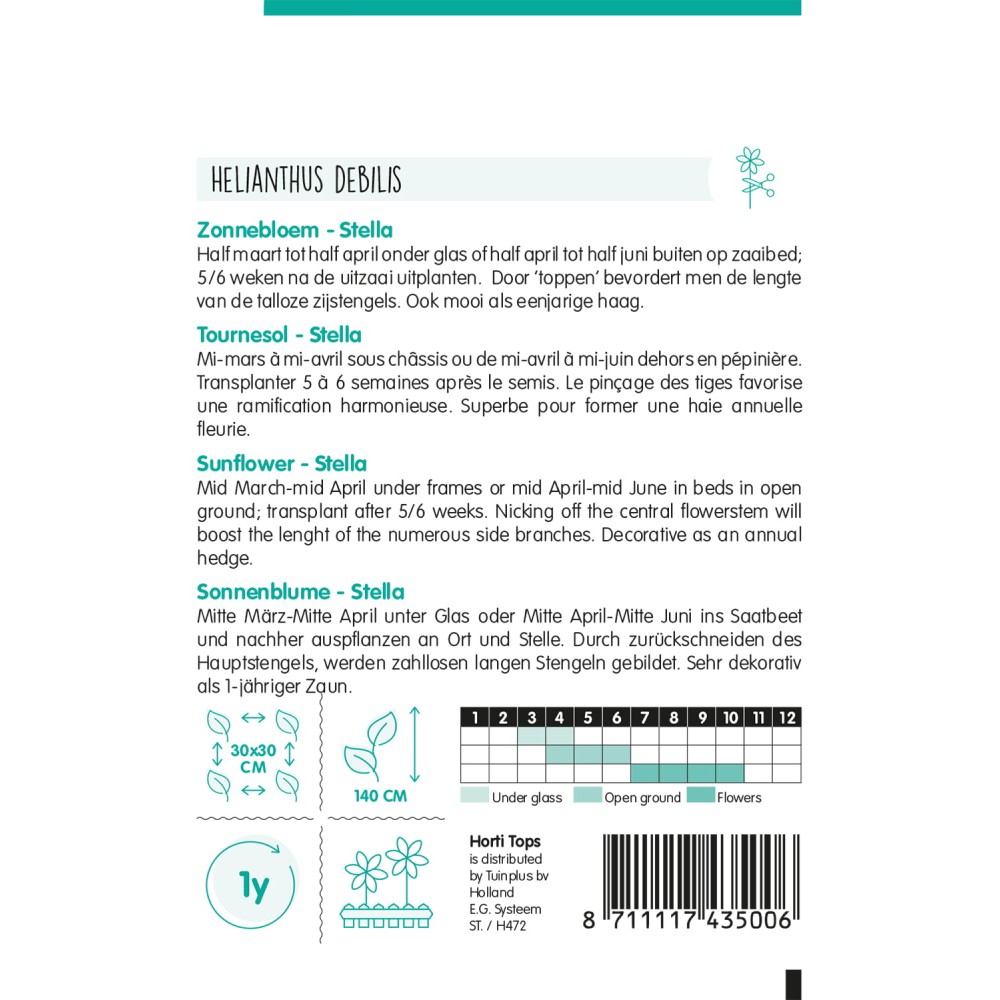 Tournesol - Stella Mi-mars à mi-avril sous châssis ou de mi-avril à mi-juin dehors en pépinière. Transplanter 5 à 6 semaines après le semis. Le pinçage des tiges favorise une ramification harmonieuse. Superbe pour former une haie annuelle fleurie.