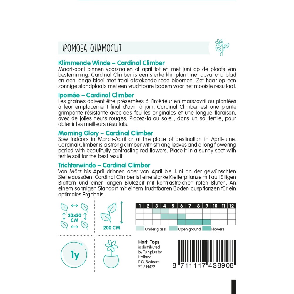 Ipomée – Cardinal Climber Les graines doivent être présemées à l’intérieur en mars/avril ou plantées à leur emplacement final d’avril à juin. Cardinal Climber est une plante grimpante résistante avec des feuilles originales et une longue floraison, avec de jolies fleurs rouges. Placez-la au soleil, dans un sol fertile, pour obtenir les meilleurs résultats.