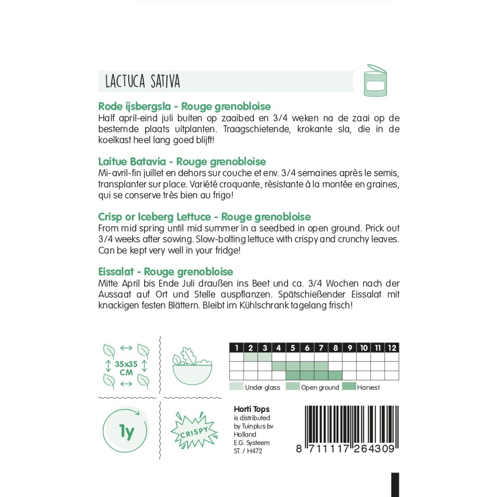 Mi-avril-fin juillet en dehors sur couche et env. 3/4 semaines après le semis, transplanter sur place. Variété croquante, résistante à la montée en graines, qui se conserve très bien au frigo!