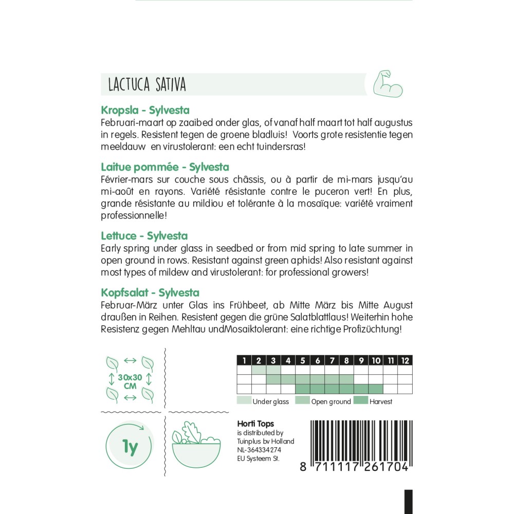 Laitue pommée - Sylvesta Février-mars sur couche sous châssis, ou à partir de mi-mars jusqu’au mi-août en rayons. Variété résistante contre le puceron vert! En plus, grande résistante au mildiou et tolérante à la mosaïque: variété vraiment professionnelle!