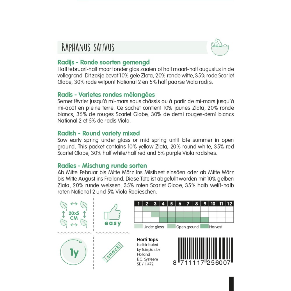 Radis - Varietes rondes mélangées Semer février jusqu’à mi-mars sous châssis ou à partir de mi-mars jusqu’à mi-août en pleine terre. Ce sachet contient 10% jaunes Zlata, 20% ronde blancs, 35% de rouges Scarlet Globe, 30% de demi rouges-demi blancs National 2 et 5% de radis Viola.