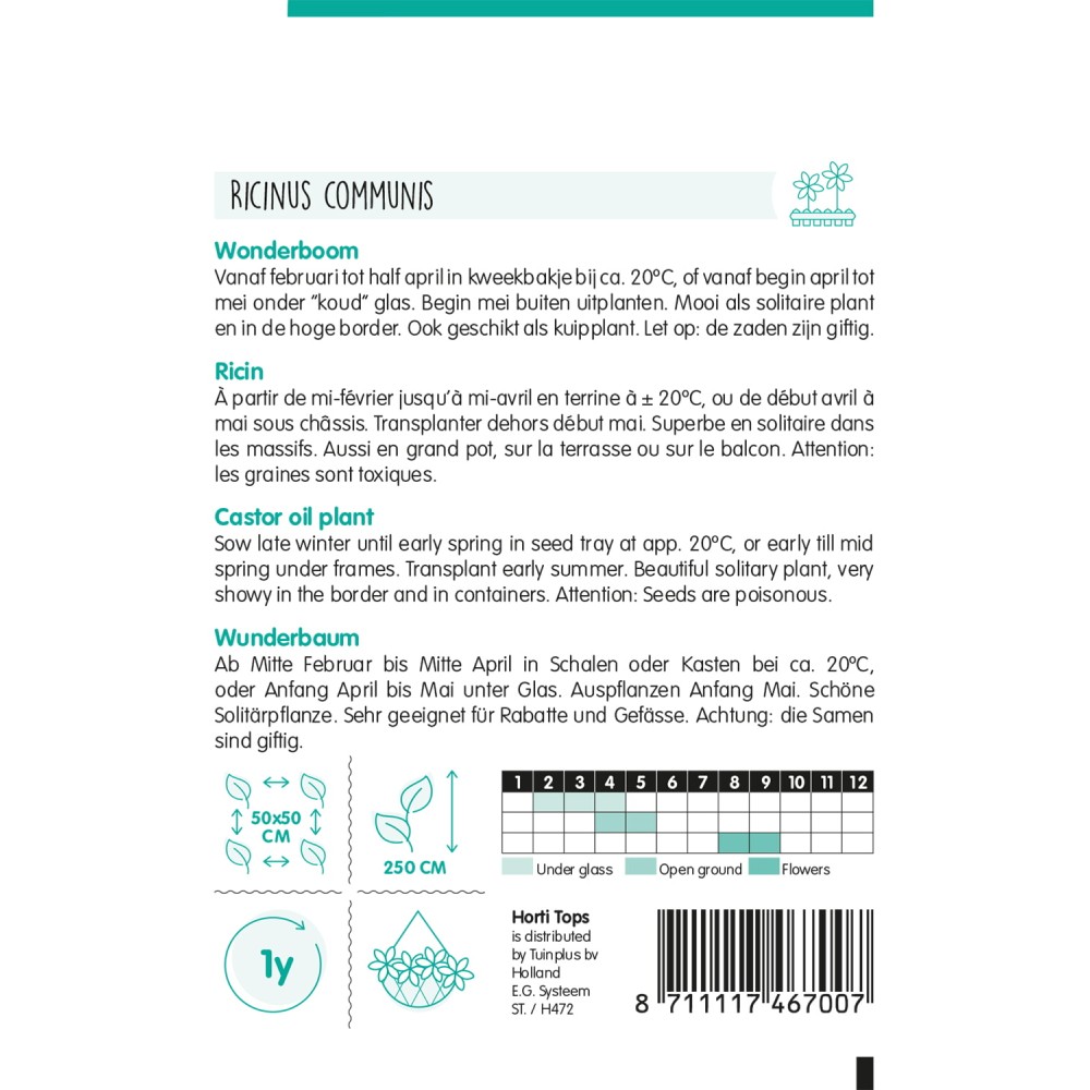 Ricin À partir de mi-février jusqu’à mi-avril en terrine à ± 20ºC, ou de début avril à mai sous châssis. Transplanter dehors début mai. Superbe en solitaire dans les massifs. Aussi en grand pot, sur la terrasse ou sur le balcon. Attention: les graines sont toxiques.