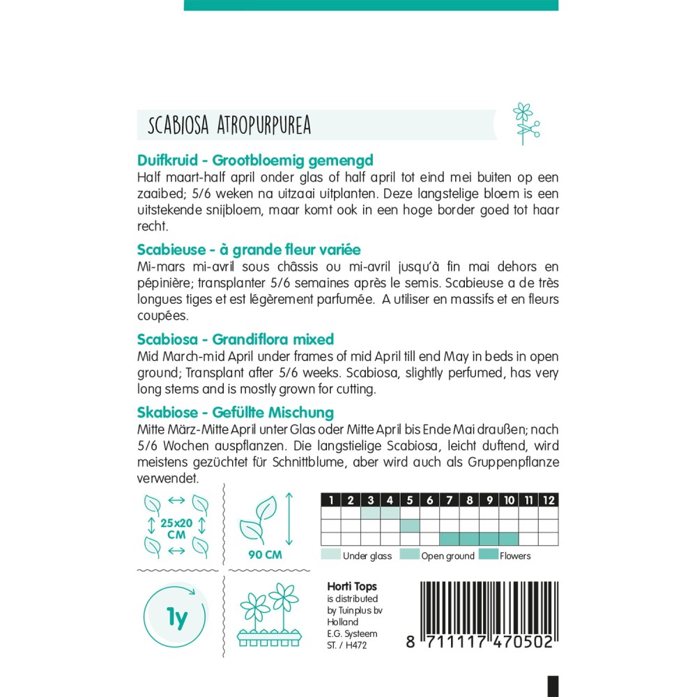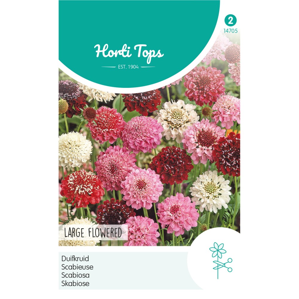 Mi-mars mi-avril sous châssis ou mi-avril jusqu’à fin mai dehors en pépinière; transplanter 5/6 semaines après le semis. Scabieuse a de très longues tiges et est légèrement parfumée. A utiliser en massifs et en fleurs coupées.